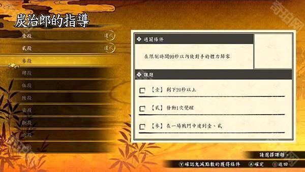 在该模式中,能够与指导者角色展开战斗。每位指导者均设有从“壹之段”至“拾之段”共10个指导阶段,只要在规定时间内取胜,就能完成当前阶段,并解锁下一阶段。只要完成一个阶段,或者完成各阶段里的课题,便可获取鬼灭点数。